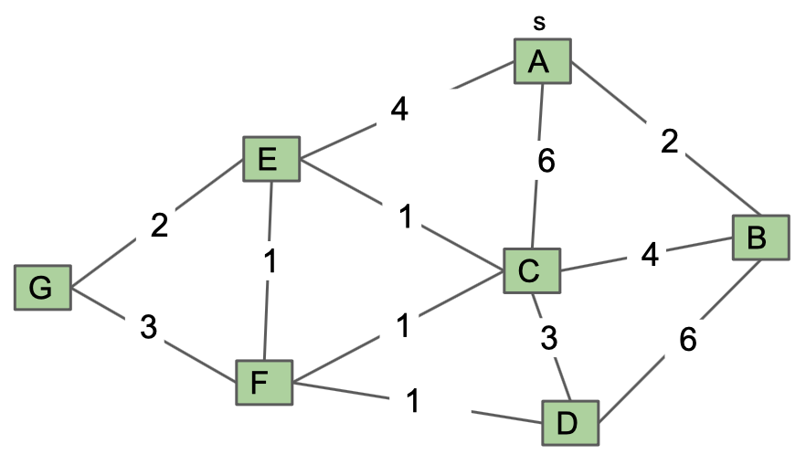 Questions 1 and 2, suppose we run Dijkstra's from A. Break ties alphabetically. Breaking ties alphabetically means that if we insert B into the fringe, and C is in the fringe with the same priority, we have a tie! To break this tie, we will do so alphabetically, putting B before C.