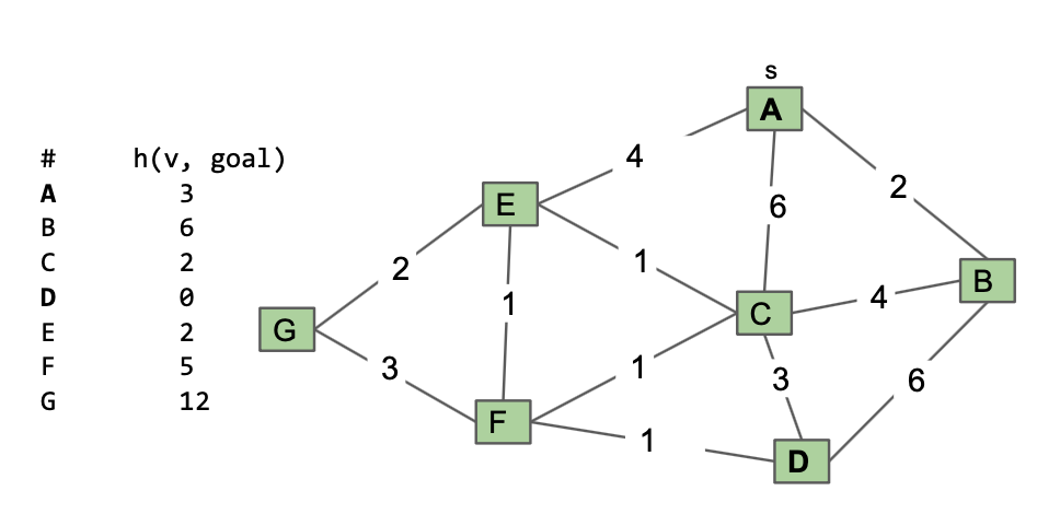 For questions 3-5, suppose we run A* from A to D. Break ties alphabetically