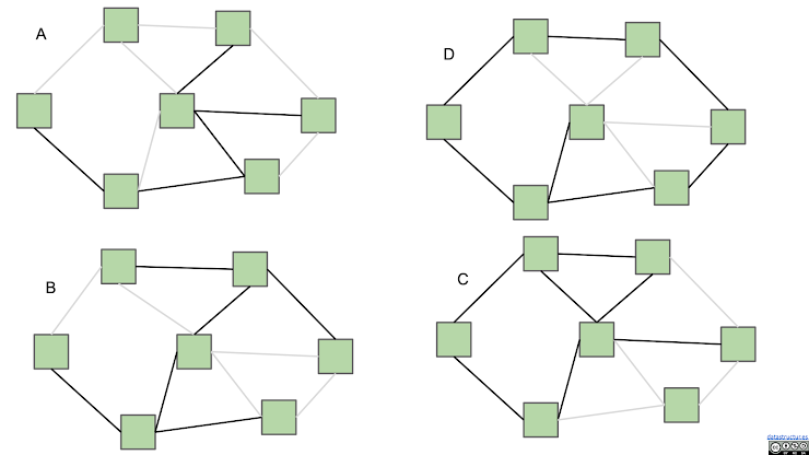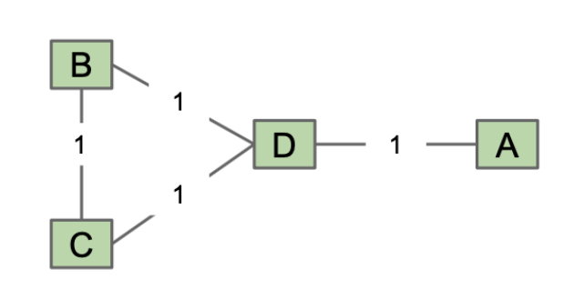 Prim’s starting from A will select AD, BD, and CD, whereas Kruskals will select AD, BC, and BD.