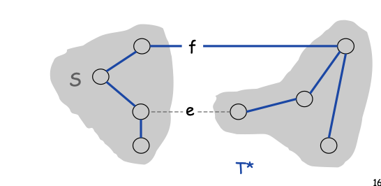 Removing f disconnects our MST T. Form a cut with the two sides of the MST after f is removed.