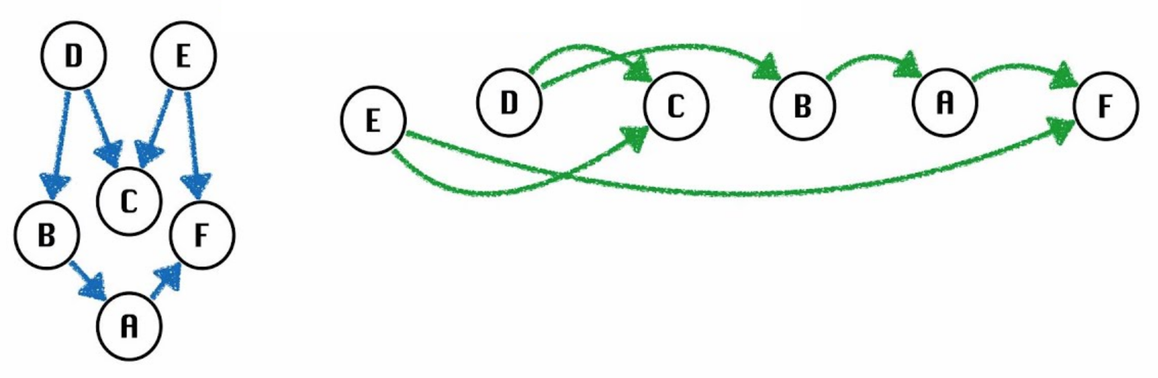 Notice that the topological sort for the above DAG has to start with either D or E and must end with F or C. For this reason, D and E are called sources, and F and C are called sinks.