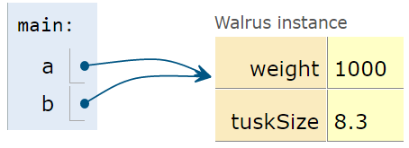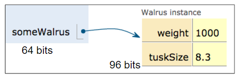 In real implementations of the Java programming language, there is actually some additional overhead for any object, so a Walrus takes somewhat more than 96 bits. However, for our purposes, we will ignore such overhead, since we will never interact with it directly.