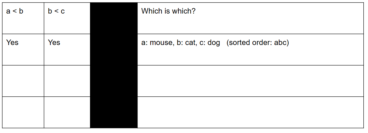 Let's say we place Tom the Cat, Jerry the Mouse, and Spike the Dog in opaque soundproof boxes labeled A, B, and C. We want to figure out which is which using a scale.
