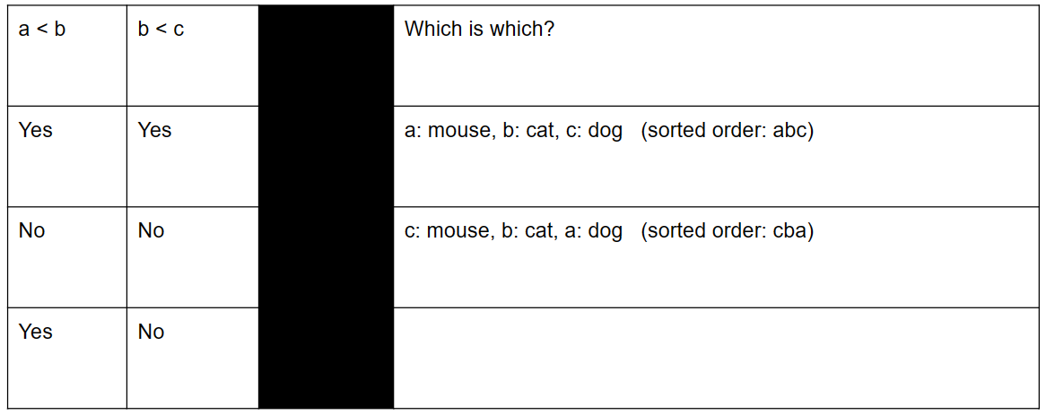 Now that we've created this table, we can create a tree to help us solve this sorting game of cat and mouse (and dog).