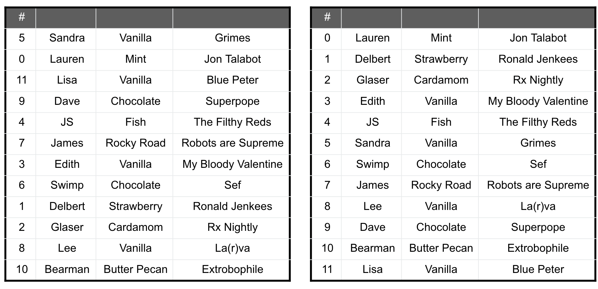 Essentially what just happened is that we first made a new array of the same size and then just copied all of the # indexes to the correct location. So first we look at 5 Sandra Vanilla Grimes and then copy this over to the 5th index in our new array.