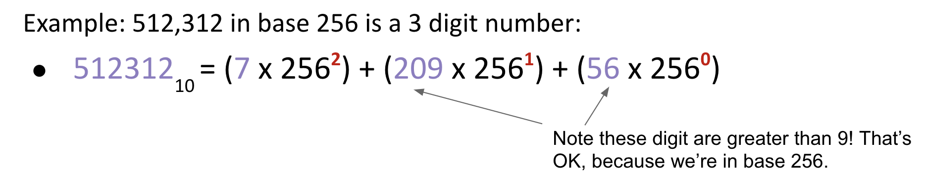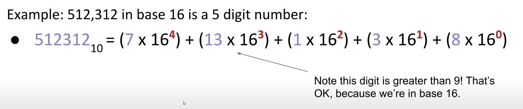 Note that we don't have to work with base 10. What we can instead do is increase this base to have less digits in our total number. This is really getting into 61C territory as we haven't really discussed binary representation of integers yet, but essentially what we want to do is convert to hexadecimal, a base 16 number that is represented with the following digits: {0, 1, 2, 3, 4, 5, 6, 7, 8, 9, A, B, C, D, E, F}. Note that A is 10 and F is 15. 0 - 15 is 16 possible values for a digit! To convert a number from decimal (base 10) to hexadecimal (base 16), we do the following: