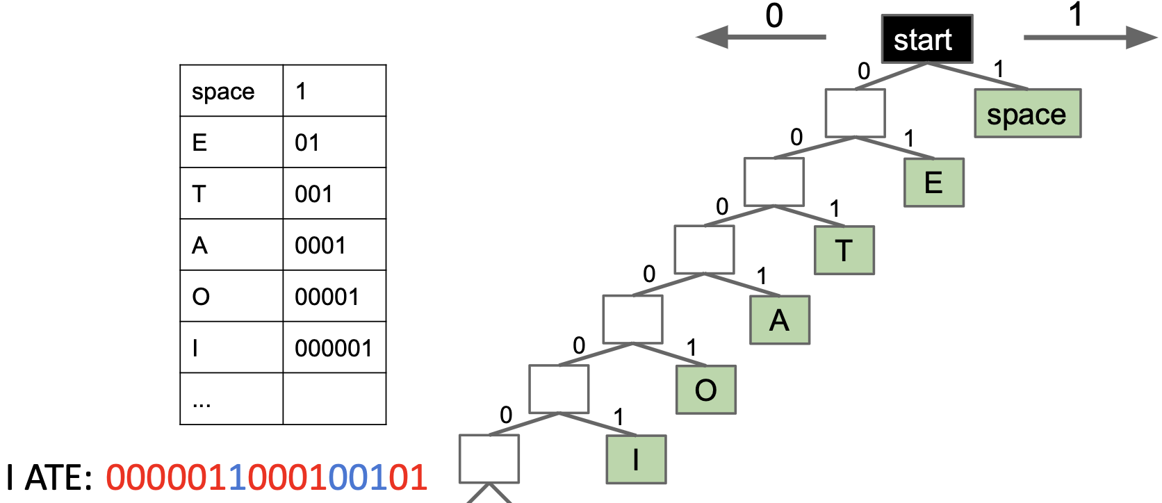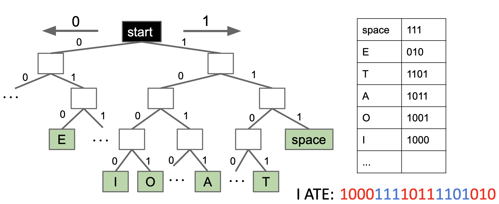 Note that some codes are more efficient for certain strings than others: in the first representation, I ATE uses less bits than the second code. However, this is highly dependent on what string we're trying to encode.