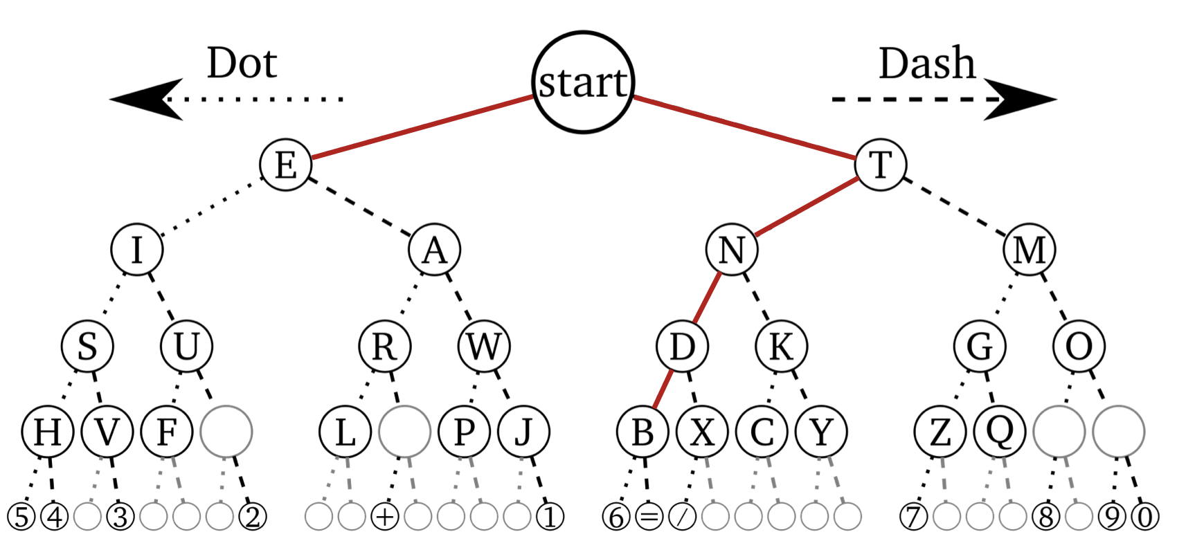Let's represent Morse code as a tree of codewords leading to symbols. As we can see from the tree, several symbols have representations that are prefixes of other symbols.