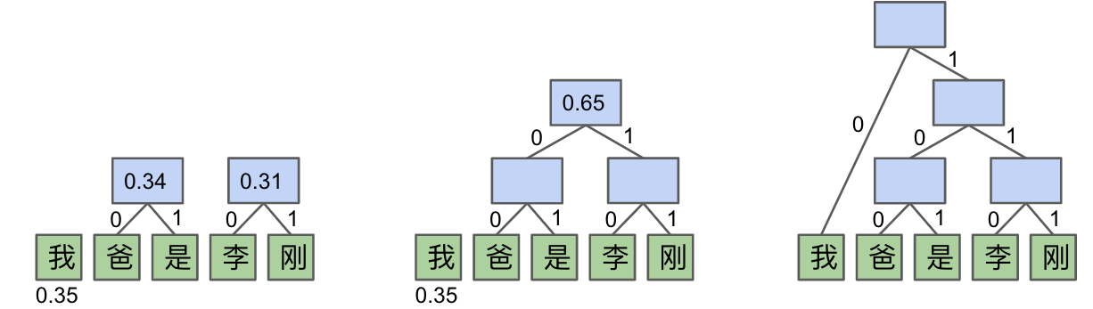 Take the two smallest nodes and merge them into a super node with weight equal to sum of weights.