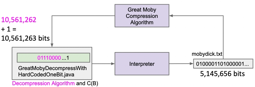 However, there is a problem with this approach. If we include the code for the decompression algorithm as part of the compressed model (recall compression model 2 from the previous chapter), we see that Moby Dick is not compressed to one bit, but actually requires more bits than the original text!
