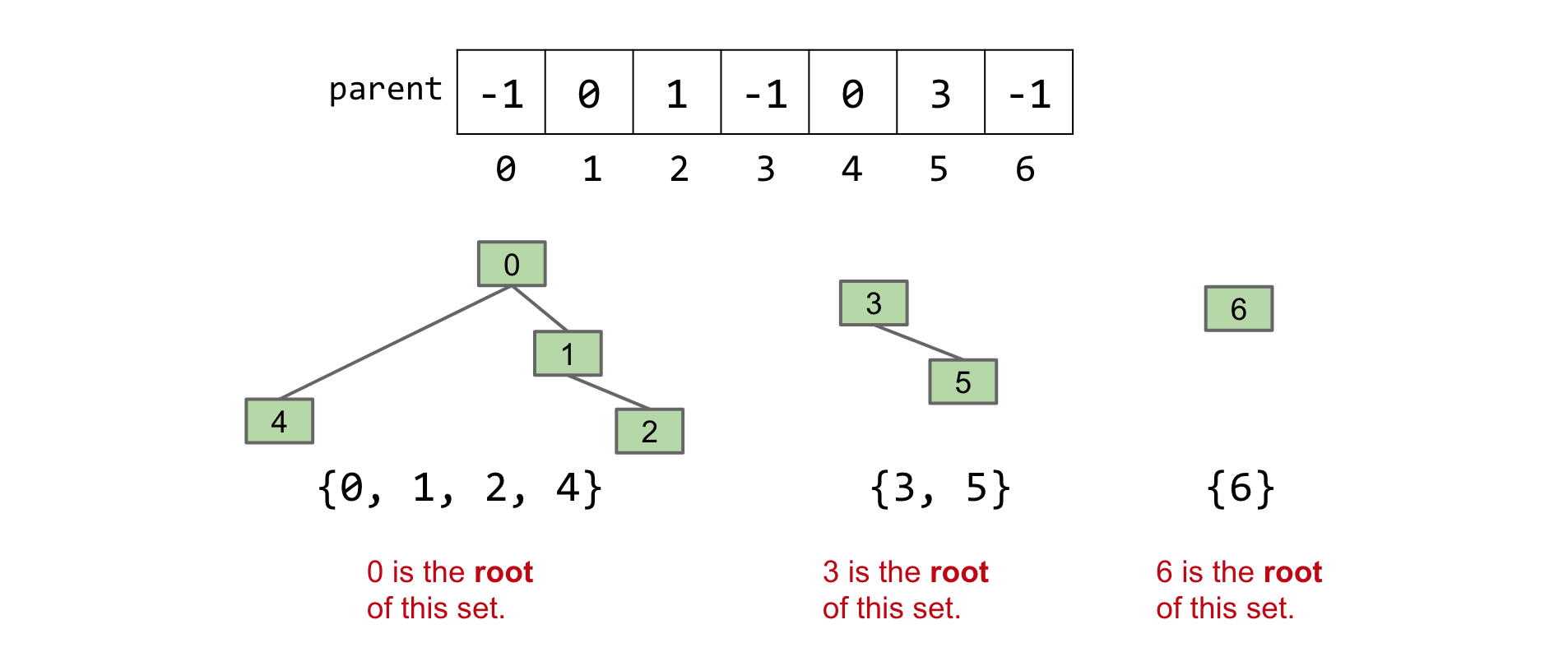 Note that we represent the sets using only an array. We visualize it ourselves as trees.