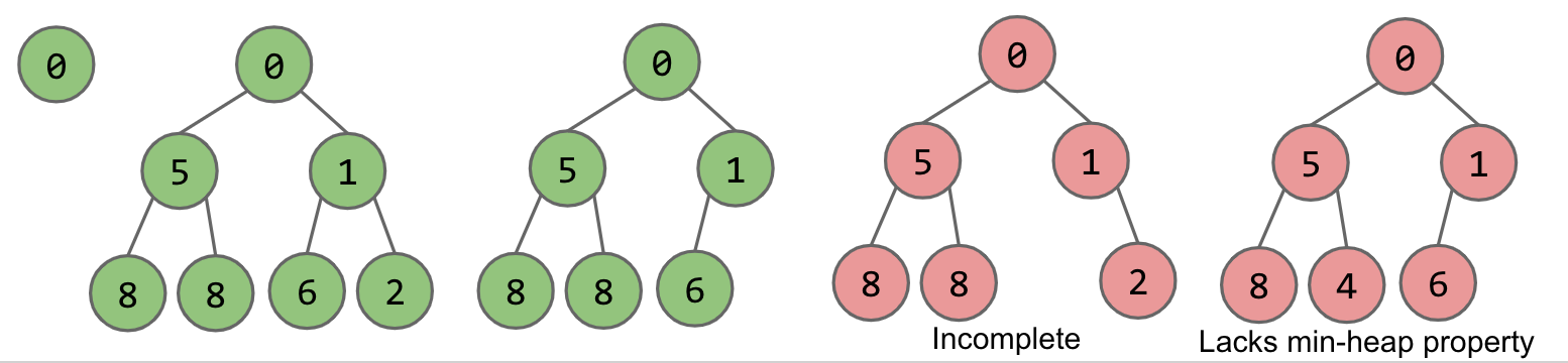 As we can see in the figures above, the green colored heaps are valid and the red ones aren't. The last two aren't because they violate at least one of the properties that we defined above.