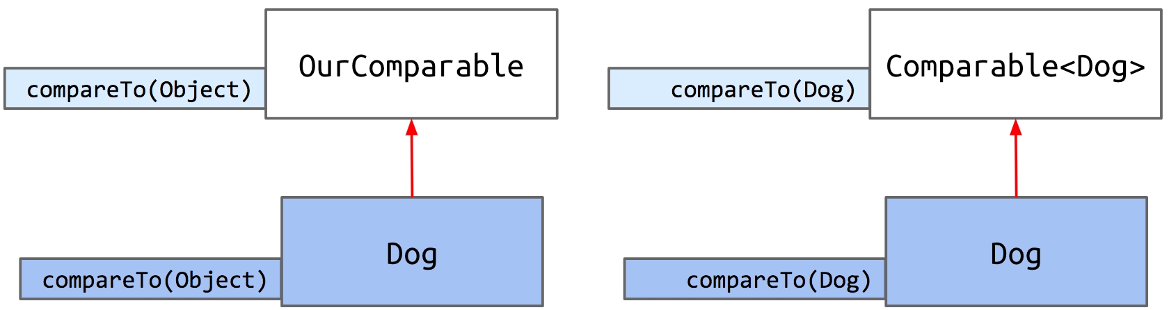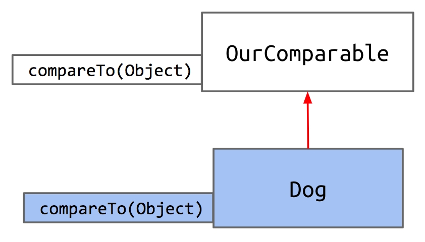 }In this case, the Dog class fails to compile. By declaring that it implements OurComparable, the Dog class makes a claim that it "is-an" OurComparable. As a result, the compiler checks that this claim is actually true, but sees that Dog doesn't implement compareTo.