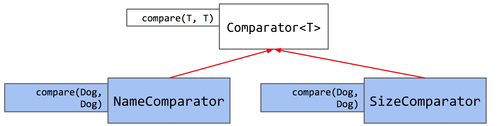 As an example, the natural ordering of Dogs, as we stated previously, is defined according to the value of size. What if we'd like to sort Dogs in a different way than their natural ordering, such as by alphabetical order of their name?