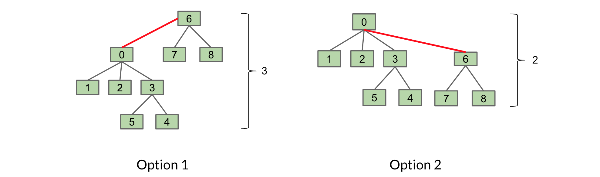 The second option is preferable as it only has a height of 2, rather than 3. By our new rule, we would choose the second option as well because T2 is smaller than T1 (size of 3 compared to 6).
