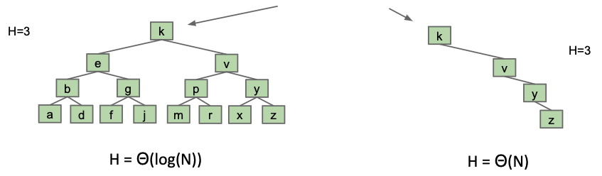 In the best case, our tree will have height $$\Theta(log N)$$, whereas in the worst case our tree has a height of $$\Theta(N)$$, at which point it basically becomes a linked list. For example, `contains` on a "spindly" BST would take linear time.