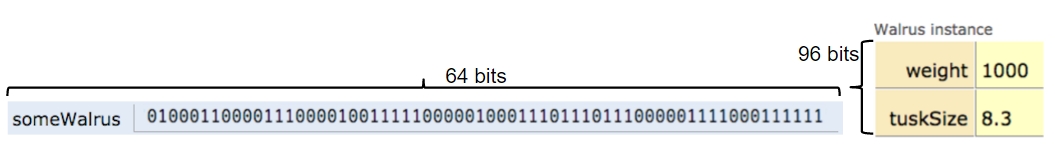In real implementations of the Java programming language, there is actually some additional overhead for any object, so a Walrus takes somewhat more than 96 bits. However, for our purposes, we will ignore such overhead, since we will never interact with it directly.