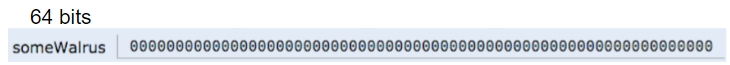 If we imagine our Walrus weight is stored starting at bit 5051956592385990207 of memory, and tuskSize starts at bit 5051956592385990239, we might store 5051956592385990207 in the Walrus variable. In binary, 5051956592385990207 is represented by the 64 bits 0100011000011100001001111100000100011101110111000001111000111111, giving us in box notation: