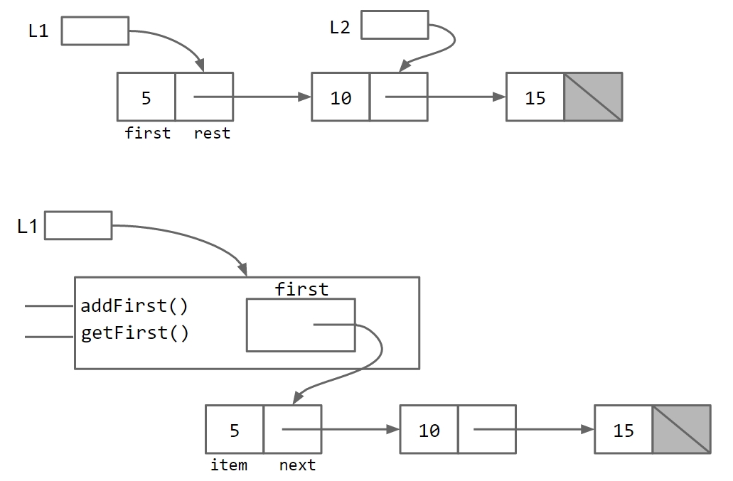 int x = L.first;Comparing the two data structures visually, we have: (with the IntList version on top and SLList version below it)