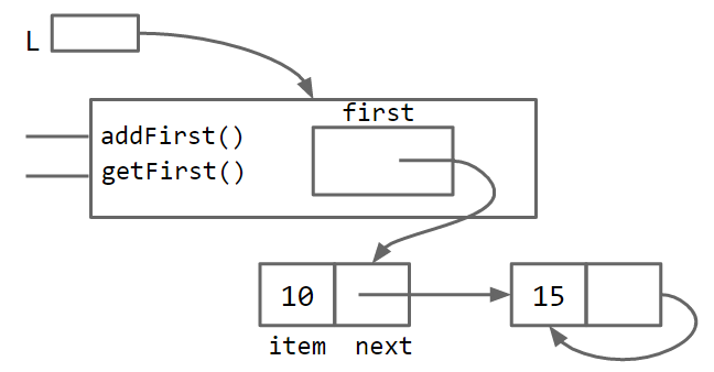 The SLList hides the detail that there exists a null link from the user. The SLList class isn't very useful yet, so let's add an addFirst and getFirst method as simple warmup methods. Consider trying to write them yourself before reading on.