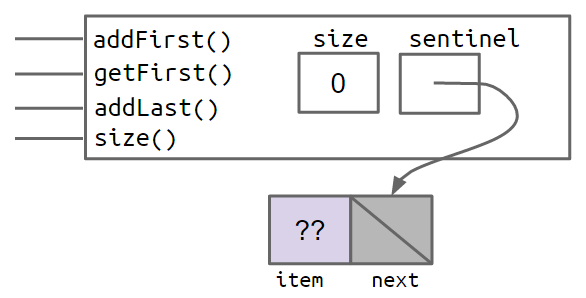 To motivate our remaining improvements and also demonstrate some common patterns in data structure implementation, we'll add addLast(int x) and size() methods. You're encouraged to take the starter code and try it yourself before reading on. I especially encourage you to try to write a recursive implementation of size, which will yield an interesting challenge.