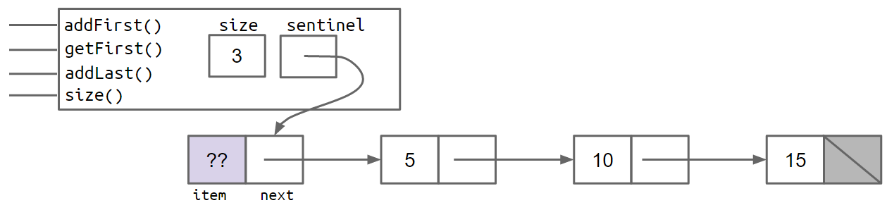 A cleaner, though less obvious solution, is to make it so that all SLLists are the "same", even if they are empty. We can do this by creating a special node that is always there, which we will call a sentinel node. The sentinel node will hold a value, which we won't care about.
