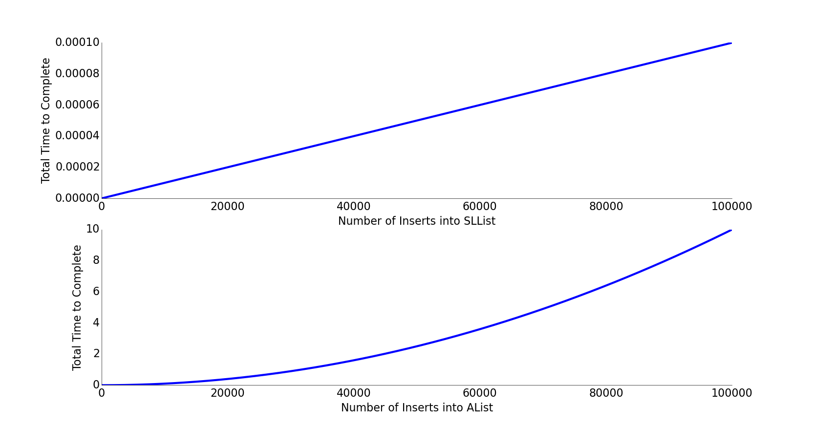 Repeating our computational experiment from before, we see that our new AList completes 100,000 inserts in so little time that we don't even notice. We'll defer a full analysis of why this happens until the final chapter of this book.