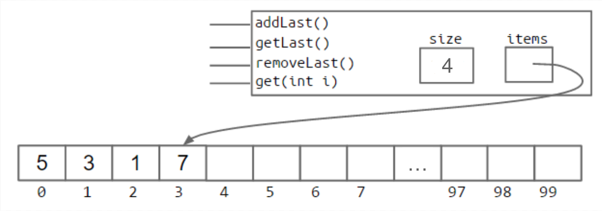 Optional Exercise 2.5.1: Try to build an AList class that supports addLast, getLast, get, and size operations. Your AList should work for any size array up to 100. For starter code, see https://github.com/Berkeley-CS61B/lectureCode/tree/master/lists4/DIY.